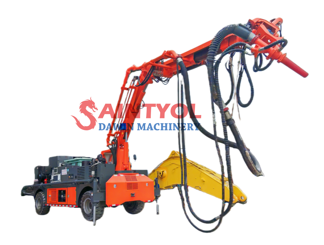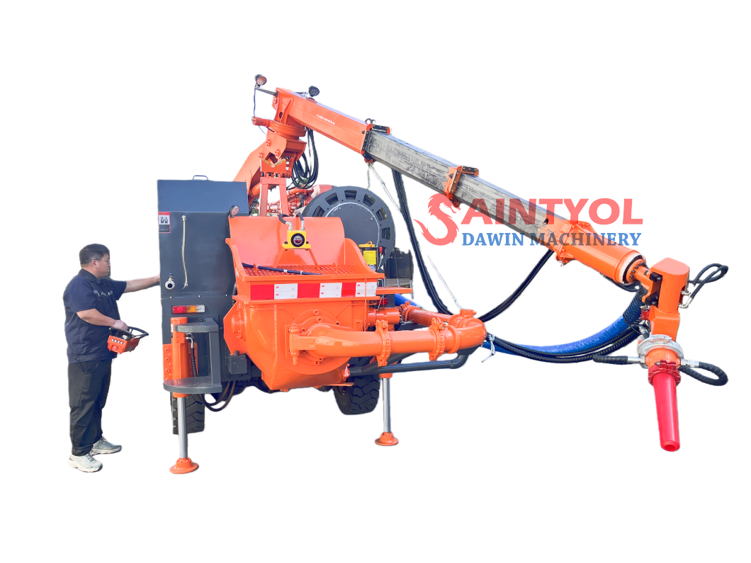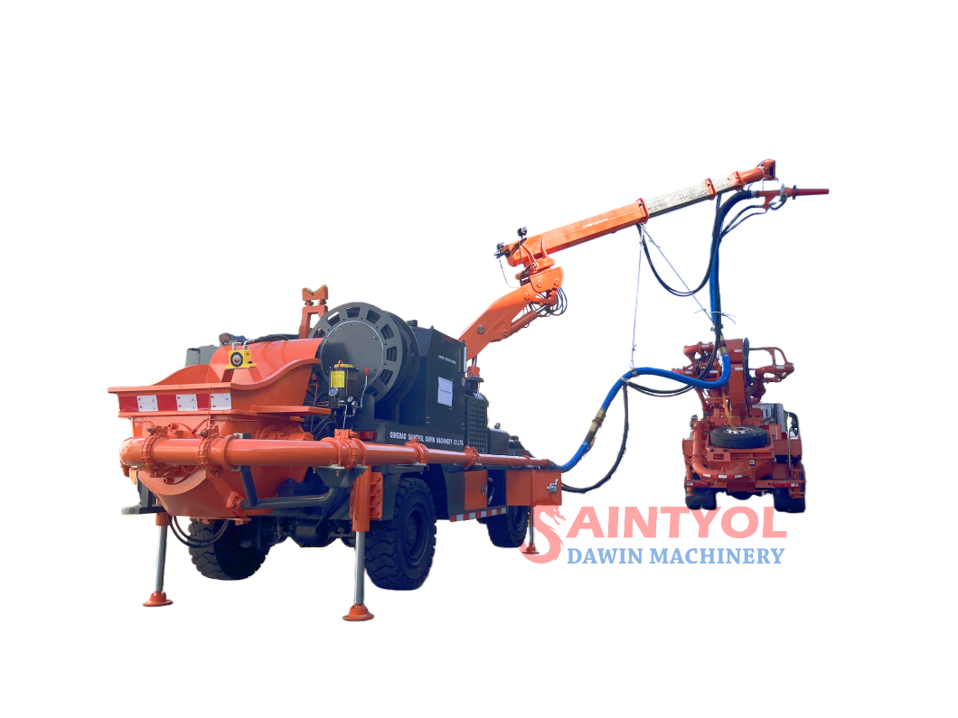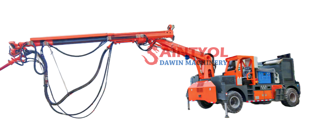 On the front lines of railway tunnel, highway slope, and water conservancy culvert construction, concrete spraying and shotcrete is always of paramount importance—ensuring project quality, meeting deadlines, ensuring safety, and balancing environmental protection and cost. The pain points of traditional construction methods are no longer adequate for the high-efficiency demands of modern infrastructure. Today, we introduce an "all-rounder" to infrastructure professionals—the Qingdao Saintyol DAWIN intelligent shotcrete robot wet concrete spraying trolley. Built with scientific and technological innovation and craftsmanship, it solves construction pain points with its robust performance, becoming the preferred partner for countless infrastructure projects, demonstrating the confidence and responsibility of "Made in China 2025." Saintyol DAWIN Machinery has been deeply involved in the construction machinery equipment field for many years, adhering to the philosophy of "people-oriented, technology-driven enterprise," integrating technological innovation into every detail of its products. Its wet spraying trolleys cover large, medium, and small cross-section working conditions, emphasizing high efficiency, flexibility, safety, and environmental friendliness. It precisely addresses the pain points of traditional spraying operations, such as low efficiency, high dust levels, and difficulty in quality control, adapting to the construction needs of various scenarios including tunnels, mines, water conservancy, and slope protection. Whether for precise operations in narrow tunnels or wide-area coverage of large-section projects, the Saintyol DAWIN wet concrete spraying trolley with shotcrete robot is perfectly adaptable.